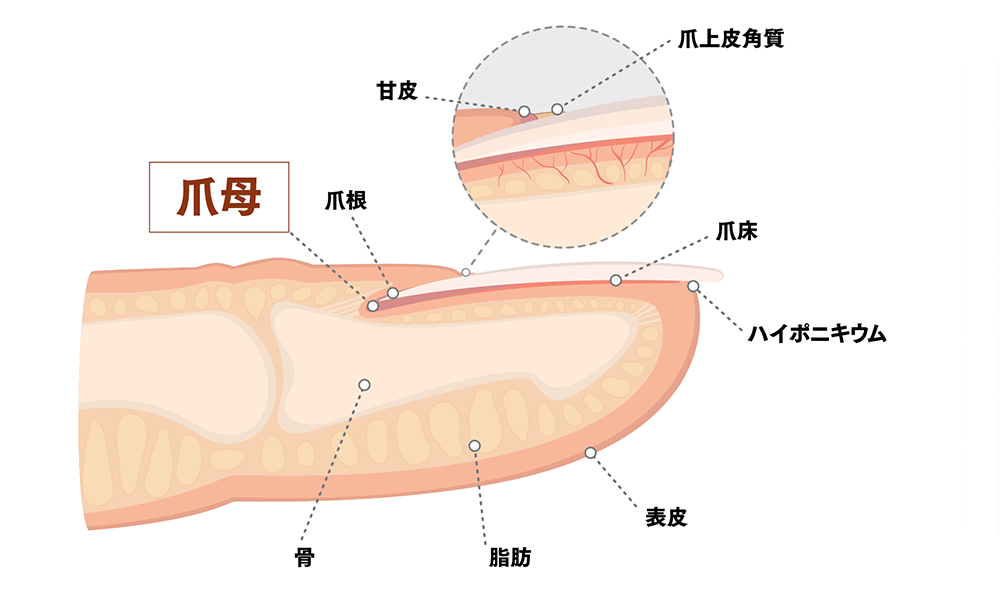 爪の根元にある 爪母(そうぼ)細胞 が新しいケラチンを作り続け、その積み重ねによって爪は伸びていきます。