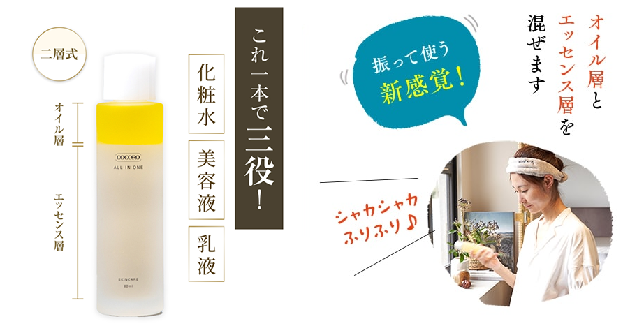 COCOROオールインワン(※旧名称COCORO化粧美容乳液)は、「オイル層」と「エッセンス層」を振って混ぜ合わせてから使う、まるでドレッシグのような新感覚オールインワン化粧品。