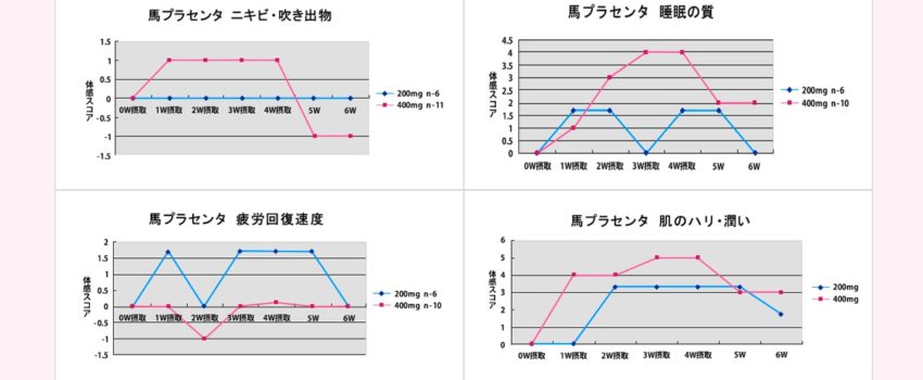 1つ目の試験は馬プラセンタを摂取することによって、肌のハリや潤い、にきび、吹き出物などのお肌の状態の変化や、疲労感の回復速度や睡眠の質の変化について調査し、グラフにいたしました。 2つ目の試験は二重盲検試験にて馬プラセンタが入っているサプリメントと、馬プラセンタの全く入っていないプラセボ(偽薬)を飲 … 続きを読む 馬プラセンタ臨床試験のご報告